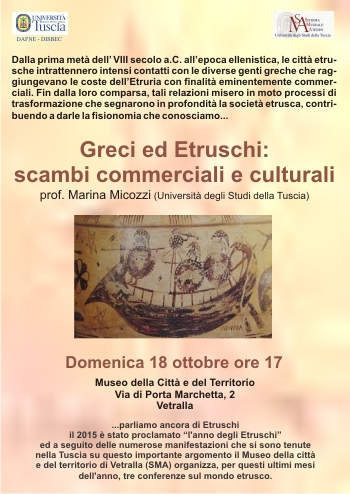 ...parliamo ancora di Etruschi il 2015 è stato proclamato "l'anno degli Etruschi" ed a seguito delle numerose manifestazioni che si sono tenute nella Tuscia su questo importante argomento il Museo della città e del territorio di Vetralla (SMA) organizza, per questi ultimi mesi dell'anno, tre conferenze sul mondo etrusco Domenica 18 ottobre, ore 17 Dalla prima metà dell’ VIII secolo a.C. all’epoca ellenistica, le città etrusche intrattennero intensi contatti con le diverse genti greche che raggiungevano le coste dell’Etruria con finalità eminentemente commerciali. Fin dalla loro comparsa, tali relazioni misero in moto processi di trasformazione che segnarono in profondità la società etrusca, contribuendo a darle la fisionomia che conosciamo. Ad esse si devono l’acquisizione di abilità tecniche e artigianali - come l’uso del tornio o la messa in opera di tetti di tegole, introdotti in Etruria da artigiani greci immigrati -, l’adozione di costumi greci e dell’apparato degli utensili necessari alla loro pratica, la circolazione di influenze stilistiche che segnano tutto il percorso dell’arte etrusca, ma anche, ciò che è più straordinario, l’acquisizione di forme mentali e convinzioni religiose che trasformarono questo popolo di barbaroi occidentali in uno dei più profondamente ellenizzati del Mediterraneo antico."