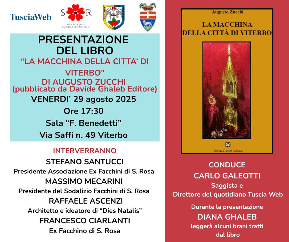 Presentazione del libro “La Macchina della Città di Viterbo” di Augusto Zucchi Venerdì 29 agosto, alle ore 17:30 presso la Sala F. Benedetti in via Saffi 49 a Viterbo, si terrà la presentazione ufficiale del libro "La Macchina della Città di Viterbo", scritto da Augusto Zucchi e pubblicato da Davide Ghaleb Editore. L'evento, patrocinato dalla Provincia di Viterbo e dal Sodalizio dei Facchini di Santa Rosa e organizzato dall'Associazione Ex Facchini di Santa Rosa, vedrà la partecipazione di: Stefano Santucci, Presidente Associazione Ex Facchini di S. Rosa; Massimo Mecarini, Presidente del Sodalizio dei Facchini di Santa Rosa; Raffaele Ascenzi, architetto e ideatore di Dies Natalis e Francesco Ciarlanti, ex facchino di Santa Rosa. Conduce l’incontro: Carlo Galeotti, direttore di Tusciaweb. Il volume di Augusto Zucchi è un racconto di fede che abbraccia mezzo millennio di storia viterbese, passando di epoca in epoca, un percorso pieno di avventure, di momenti difficili ed esaltanti, ma che hanno acceso la speranza in ogni suo protagonista nel raggiungere la sua meta e lasciare un solco indelebile nell’animo di coloro che hanno potuto conoscere ed assistere ad imprese memorabili e piene di significato. Ingresso libero