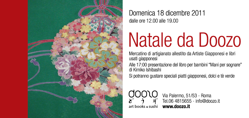 Nell'ambito della manifestazione NATALE DOOZO, domenica 18dicembre alle ore 16,00, a Roma, presso DOOZO ART BOOK & SUSHI, ci sarà uno spazio dedicato all’animazione e alla lettura con il libro dell'artista Kimiko Ishibashi "Mani per Sognare". Tutti i bambini di età compresa fra i 3 e i 7 anni sono invitati con i loro genitori nella sala dediacta alla lettura in via Palermo 51-53. Gli animali di pezza sono presto diventati protagonisti di favole e racconti; una grande scatola ricoperta di stoffa è diventata la loro casa, dove si incontrano tutti insieme in cucina, bevendo tè e preparando deliziosi cibi: insalate, uova fritte, onigiri, crostate … Ho deciso di scrivere alcune di queste storie nella mia lingua, il giapponese; poi, con l'aiuto di mio marito, le ho tradotte in italiano e Gabriella Norcia le ha trasformate in brevi filastrocche. Aggiungendo agli animali e ai testi disegni colorati ad acquerello e matita, ne abbiamo fatto un libro. L'abbiamo chiamato “Mani per sognare” perché le mani sono il prezioso strumento che ha reso possibile questa piccola avventura” (Kimiko Ishibashi). Kimiko Ishibashi è un’artista formatasi presso la Scuola d'Arte dell’Università Tokai di Tokyo. Dopo la laurea (1993) ha conseguito un master degree in pittura all’Università Nihon di Tokyo (1995), quindi ha frequentato corsi di pittura presso l’Accademia di Belle Arti di Venezia (1996-1997).