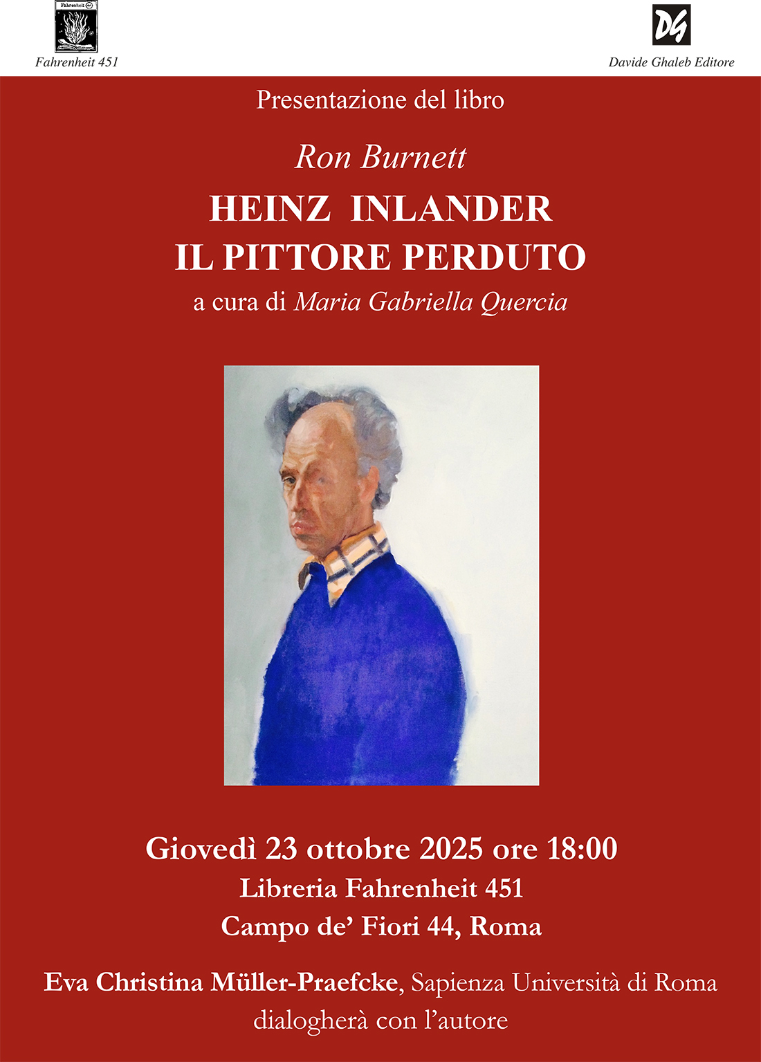 Presentazione del libro “Heinz Inlander. Il pittore perduto” di Ron Burnett La libreria Fahrenheit 451 è lieta di annunciare la presentazione del libro Heinz Inlander Il pittore perduto di Ron Burnett, a cura di Maria Gabriella Quercia. Eva Christina Müller-Praefcke (Sapienza Università di Roma) dialogherà con l'autore. Il volume racconta la vicenda del pittore Heinz Inlander e della sua famiglia, costretti a fuggire da Vienna alla vigilia dell’annessione dell’Austria da parte della Germania nazista, negli anni Trenta, alle soglie della Seconda Guerra Mondiale. Attraverso una prosa stratificata e ricca di sfumature, Ron Burnett intreccia narrativa, finzione e riflessione per delineare l’evoluzione di Inlander: da giovane rifugiato a pittore affermato negli anni Cinquanta e Sessanta. Ne emerge una storia intima di guerra e perdita, ma anche di rinascita, vissuta tra l’Italia e l’Inghilterra. Ron Burnett, studioso di fama internazionale, Presidente Emerito di Emily Carr University of Art and Design di Vancouver, č autore di numerosi saggi e libri sull’arte e sulla cultura dei media, insignito di prestigiosi riconoscimenti tra cui Order of Canada, Order of British Columbia, Ordre des Arts et des Lettres. |