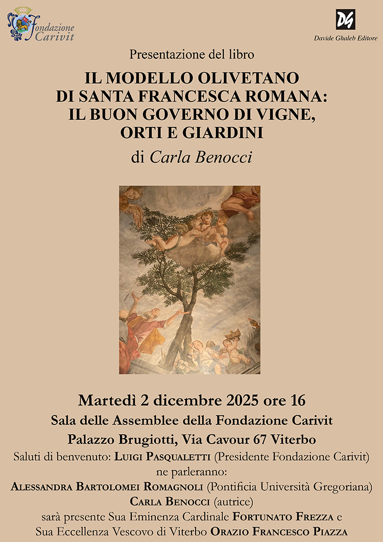 Presentazione del volume Martedì 2 dicembre 2025, alle ore 16.00, presso la Sala delle Assemblee della Fondazione Carivit nel prestigioso Palazzo Brugiotti (Via Cavour 67, Viterbo), si terrà la presentazione del nuovo libro di Carla Benocci, Il modello olivetano di Santa Francesca Romana: il buon governo di vigne, orti e giardini, pubblicato dalla casa editrice Davide Ghaleb. L’incontro si aprirà con i saluti di benvenuto di Luigi Pasqualetti (Presidente Fondazione Carivit). Saranno presenti Sua Eminenza il Cardinale Fortunato Frezza e Sua Eccellenza Orazio Francesco Piazza, Vescovo di Viterbo. ll volume ricostruisce, con rigore storico e profondità di analisi, le origini dell’Ordine femminile olivetano, nato il 15 agosto 1425 quando Francesca Bussa de’ Leoni, moglie di Lorenzo Ponziani, e le sue compagne si offrirono come oblate all’Ordine di Monte Oliveto. A seicento anni di distanza, quella scelta rivela una sorprendente attualità: un modello in cui fede, dedizione e visione comunitaria si intrecciano con un rapporto autentico e responsabile con la natura.Attraverso una lettura attenta delle cronache olivetane, delle fonti documentarie e delle testimonianze artistiche, l’autrice ricostruisce un quadro articolato che abbraccia tanti secoli di storia. Il volume è scandito in sei capitoli, ognuno dei quali mette in rilievo un aspetto specifico: dalle origini dell’Ordine olivetano alla fondazione del monastero romano di Tor de’ Specchi (1468), dall’amministrazione dei beni agricoli delle benedettine di Vetralla dalla committenza artistica, fino alla riflessione sulla continuità di un modello che si rivela straordinariamente attuale. Questo libro non è soltanto un contributo alla storia religiosa di Roma e del Lazio, ma anche un invito a riflettere sul valore attuale di un modello di sostenibilità e armonia tra uomo e natura che affonda le radici nel Quattrocento. Santa Francesca Romana – moglie, madre, fondatrice di un Ordine religioso – emerge come una figura di grande modernità: esempio di dignità conquistata, di leadership femminile e di profonda coerenza spirituale. Un modello ancora oggi attuale e fecondo. L’ingresso è libero fino a esaurimento posti. |