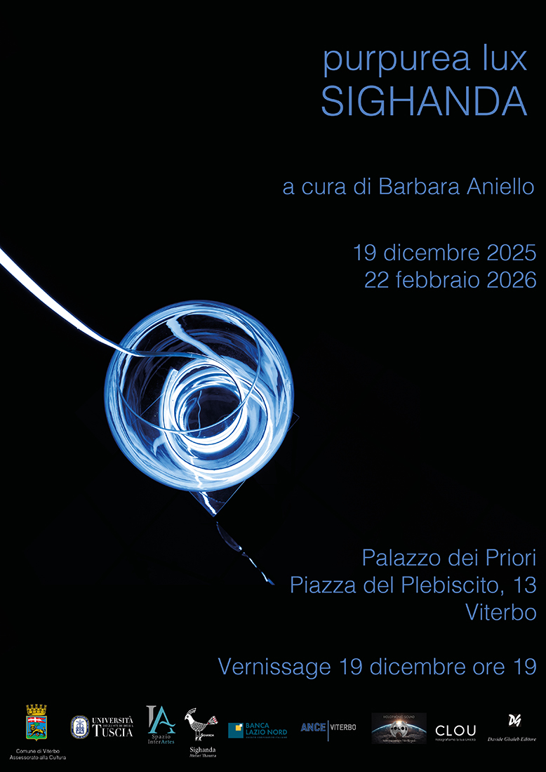 Purpurea Lux – Sighanda, a cura di Barbara Aniello Purpurea Lux è una mostra personale dell’artista italo-svizzera Sighanda a cura della storica dell’arte viterbese Barbara Aniello. Nell’itinerario, appositamente concepito per il neonato spazio espositivo di Palazzo dei Priori, si snodano 58 opere e 4 installazioni nelle stanze intitolate Autunno, Inverno, Primavera, Estate. Qui si trova quel che non ci si aspetta: nessun panorama naturale, nessun personaggio allegorico-figurativo, né tantomeno quei tipici elementi decorativi che connotano le Stagioni: tutto ciò che è vedutismo o realismo è scartato, neppure l’etichetta di astrazione è adatta a decodificare la pittura di Sighanda che conia per Viterbo e in questa mostra site specific una nuova tendenza: l’estrattismo. Si ringrazia l’Assessore Emanuele Aronne per il suo personale e incondizionato impegno a sostegno dell’iniziativa. Vernissage: 19 Dicembre ore 19, ingresso libero, piazza del Plebiscito, Viterbo Durata: 19 Dicembre-22 Febbraio, ingresso libero Enti organizzatori: Spazio Inter Artes, Atelier Thauma Patrocini e Sponsor: Comune di Viterbo, Università degli Studi della Tuscia, Ance, Banca Lazio Nord, Davide Ghaleb Editore, Holos System, Studio Clou. Accompagna la mostra il catalogo pubblicato da Davide Ghaleb Editore a cura di Barbara Aniello (info@ghaleb.it). Per informazioni e accrediti stampa: |
