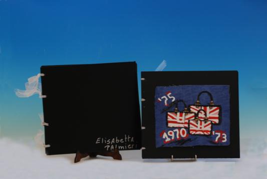 Elisabetta Palmieri, Libro d'artista, 30x30 cm interno n 4 acrilici su tessuto prestampato (serie di 12 - immagini anni '70, borse)